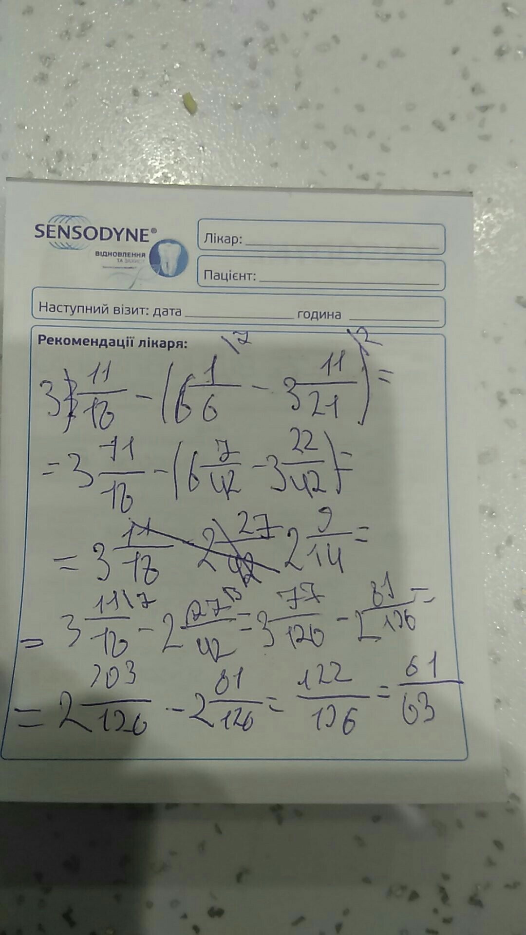 А) 3 11/18-(6 1/6 - 2 3 11/21=6 21/126-3 11/126=3 77/126-3 10/126=67/126