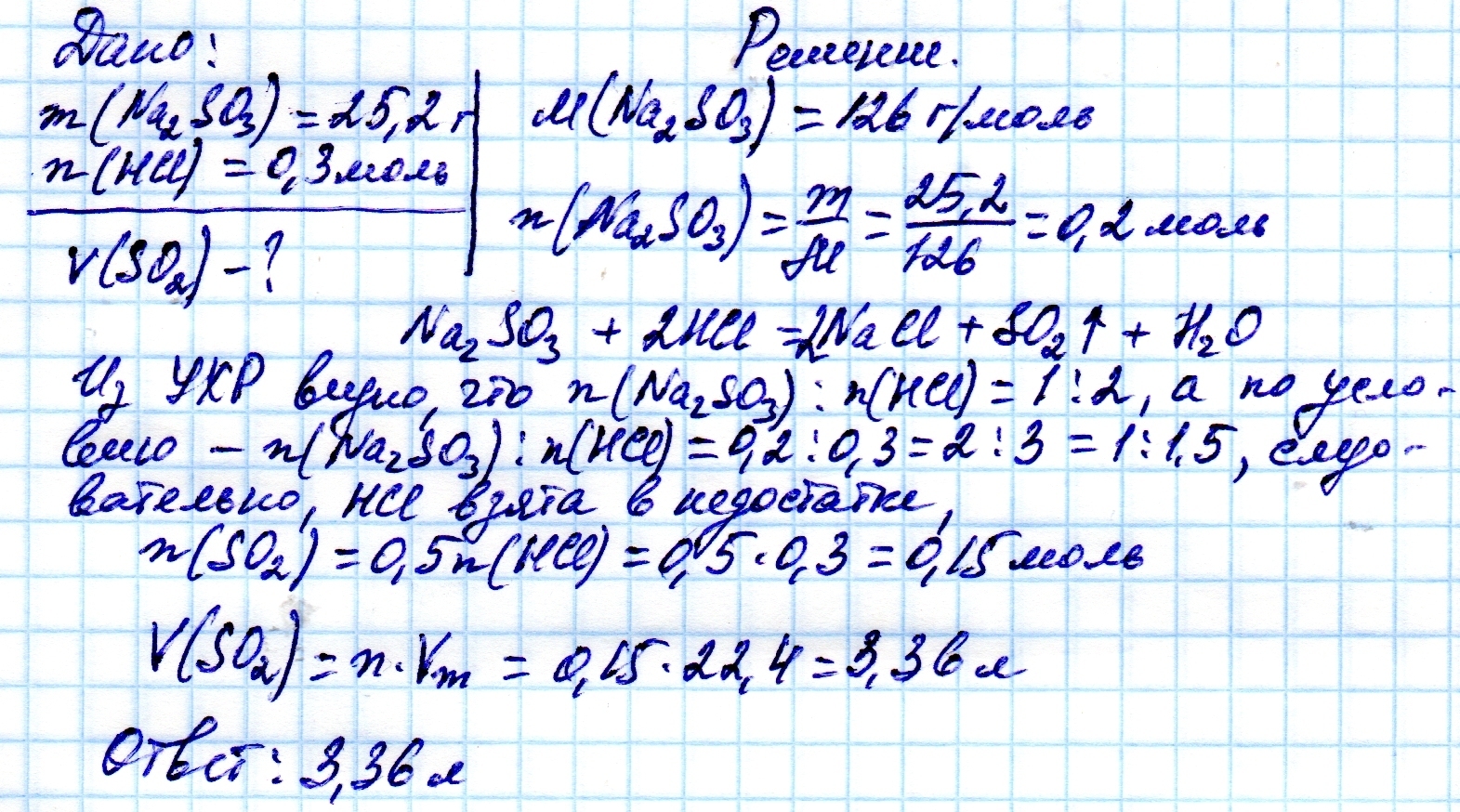 Сколько литров газа (н.у) образуется при взаимодействии 25,2 г. сульфита натрия с 0,3 моль соляной кислоты?
