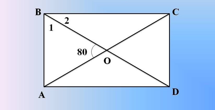 СМотри) У тебя прямоугольник, например, ABCD, у которого диагонали пересекаются в точке О, AB и CD - меньшие стороны. В прямоугольнике диагонали точкой пересечения делятся пополам., значит ΔАВО - равнобедренный. В прямоугольнике все углы 90°, значит ∠ВАО = ∠АВО = 50°; ∠ВОА=180° - 100°=80°