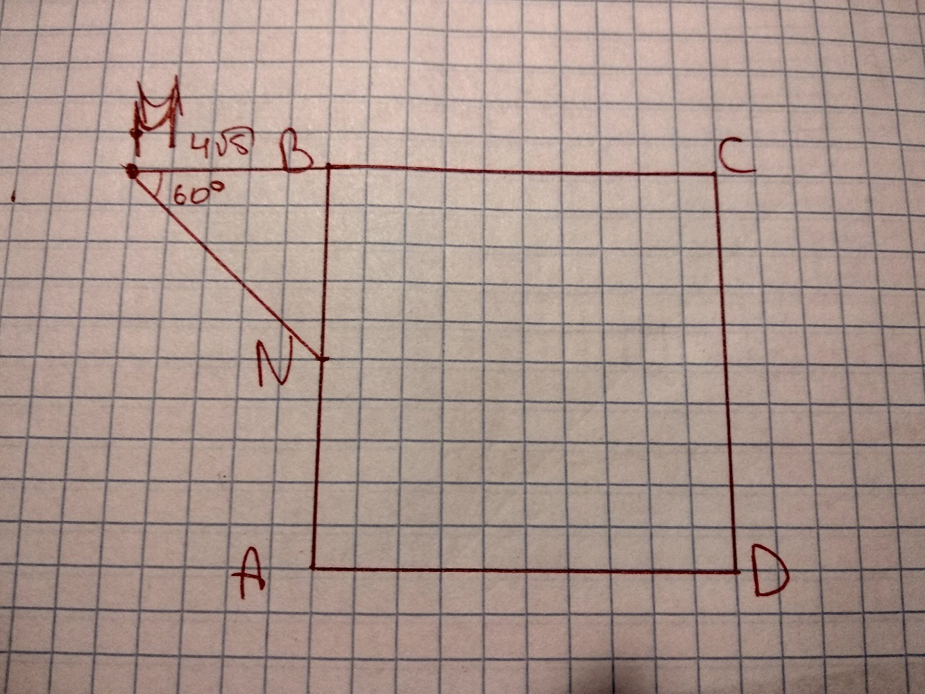 Расстояние от точки М до вершины квадрата ABCD равно 4 корень5 см, точка N-середина AB. Найдите сторону квадрата, если угол между BC и MN равен 60 градусов.