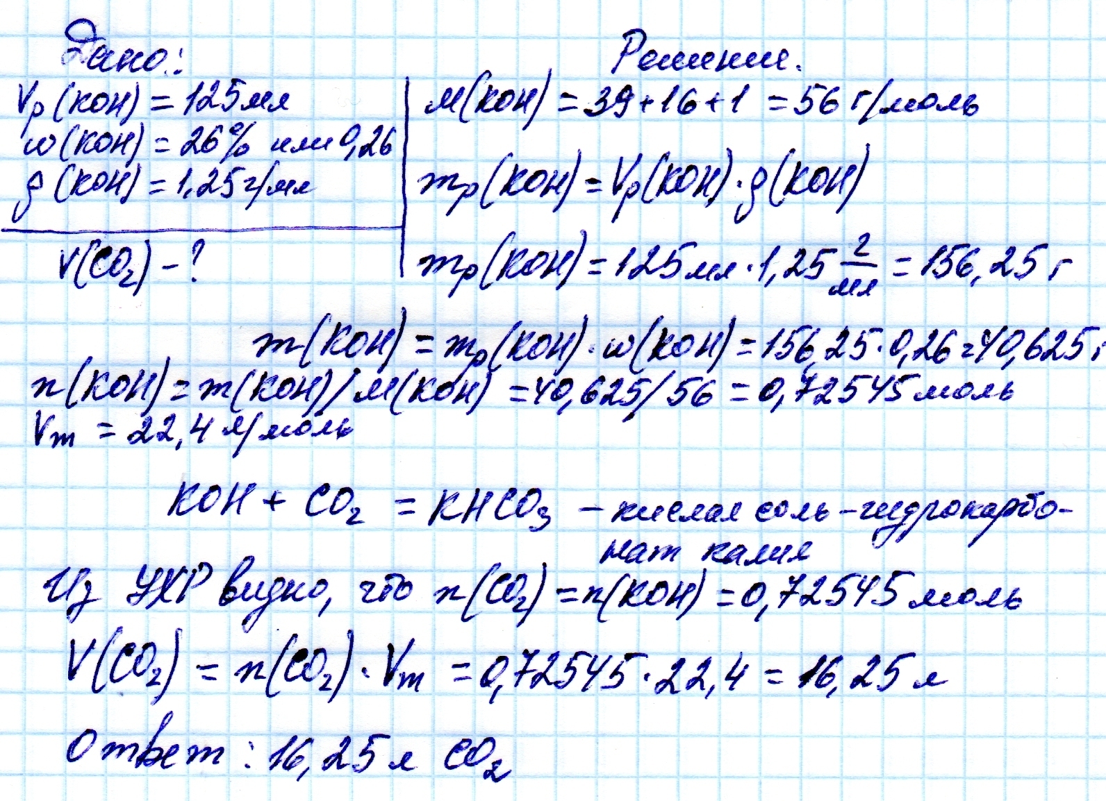 помогите решить, прошу даю 75б. Какой объем углекислого газа может впитать раствор едкого кали объемом 125 мл с массовой долей щелочи 26% и плотностью 1,25 г/мл если образуется кислая соль