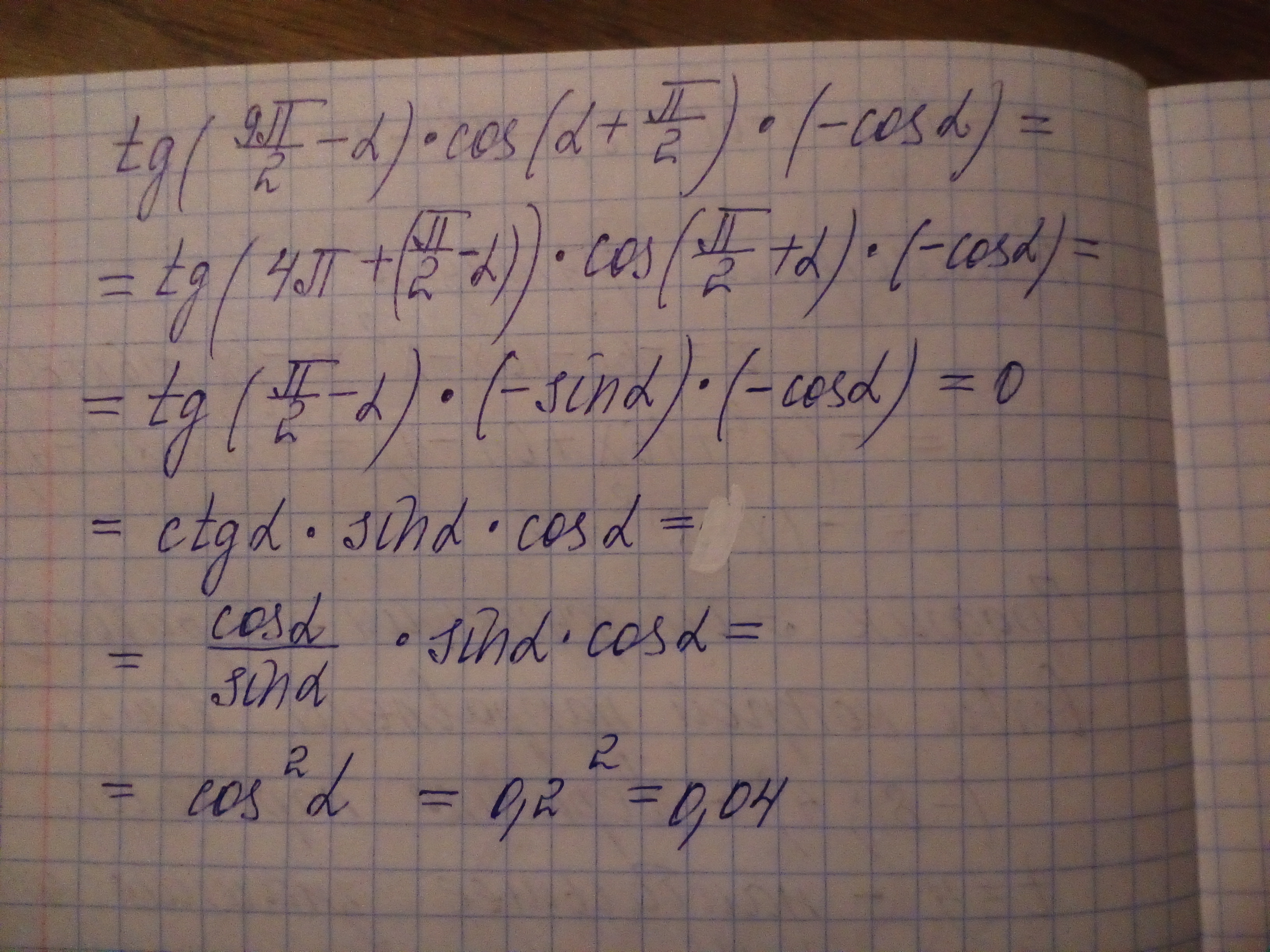 tg(9П/2-а)*cos(a+П/2)*(-cosa), если cos=0,2