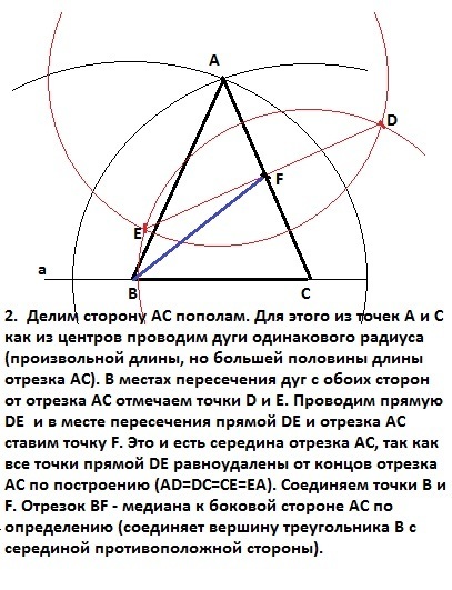 2. Делим сторону АС пополам. Для этого из точек А и С как из центров проводим дуги одинакового радиуса (произвольной длины, но большей половины длины отрезка АС). В местах пересечения дуг с обоих сторон от отрезка АС отмечаем точки D и Е. Проводим прямую DE и в месте пересечения прямой DE и отрезка АС ставим точку F. Это и есть середина отрезка АС, так как все точки прямой DE равноудалены от концов отрезка АС по построению (AD=DC=CE=EA). Соединяем точки В и F. Отрезок ВF - медиана к боковой стороне АС по определению (соединяет вершину треугольника В с серединой противоположной стороны).