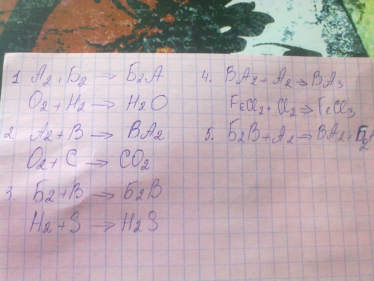 Ниже приведены уравнения реакций,протекающих между веществами, в состав которых входят атомы химических элементов А,Б,В.А2 + Б2 = Б2АА2 + В = ВА2Б2 + В = Б2ВВА2 + А2= ВА3Б2В + А2= ВА2 + Б2А Что представляют собой эти вещества? Запишите уравнения реакций,заменив буквы на символы химических элементов