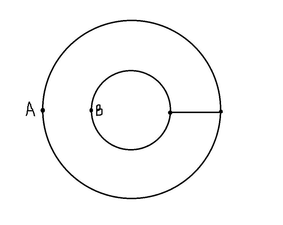 Сопротивление колец. Определите сопротивление системы проволочных колец между точками А и В (см рис.) Известно, что диаметр внешнего кольца равен 2d, внутреннего d, центры колец совпадают.Вся система состоит из проволоки одинакового сечения площадью S и удельным сопротивлением
