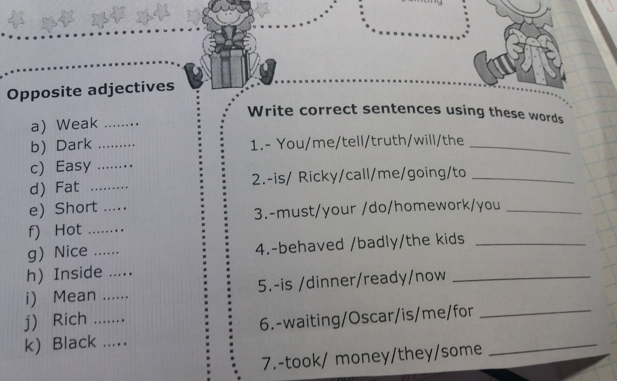 1. You will tell me the truth. 2. Ricky is going to call me. 3. You must do your homework. 4. The kids behaved badly. 5. Dinner is ready now. 6. Oscar is waiting for me. 7. They took some money.