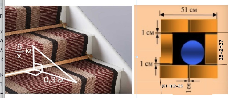 Высоту и ширину ( по горизонтали) всей лестницы можно представить катетами большого прямоугольного треугольника. Длина дорожки «распределяется» по высоте и ширине ступени (см. фото приложения). Сумма высот всех ступеней равна высоте самой лестницы, ширина лестницы равна ширине ступеней, умноженной на их количество.