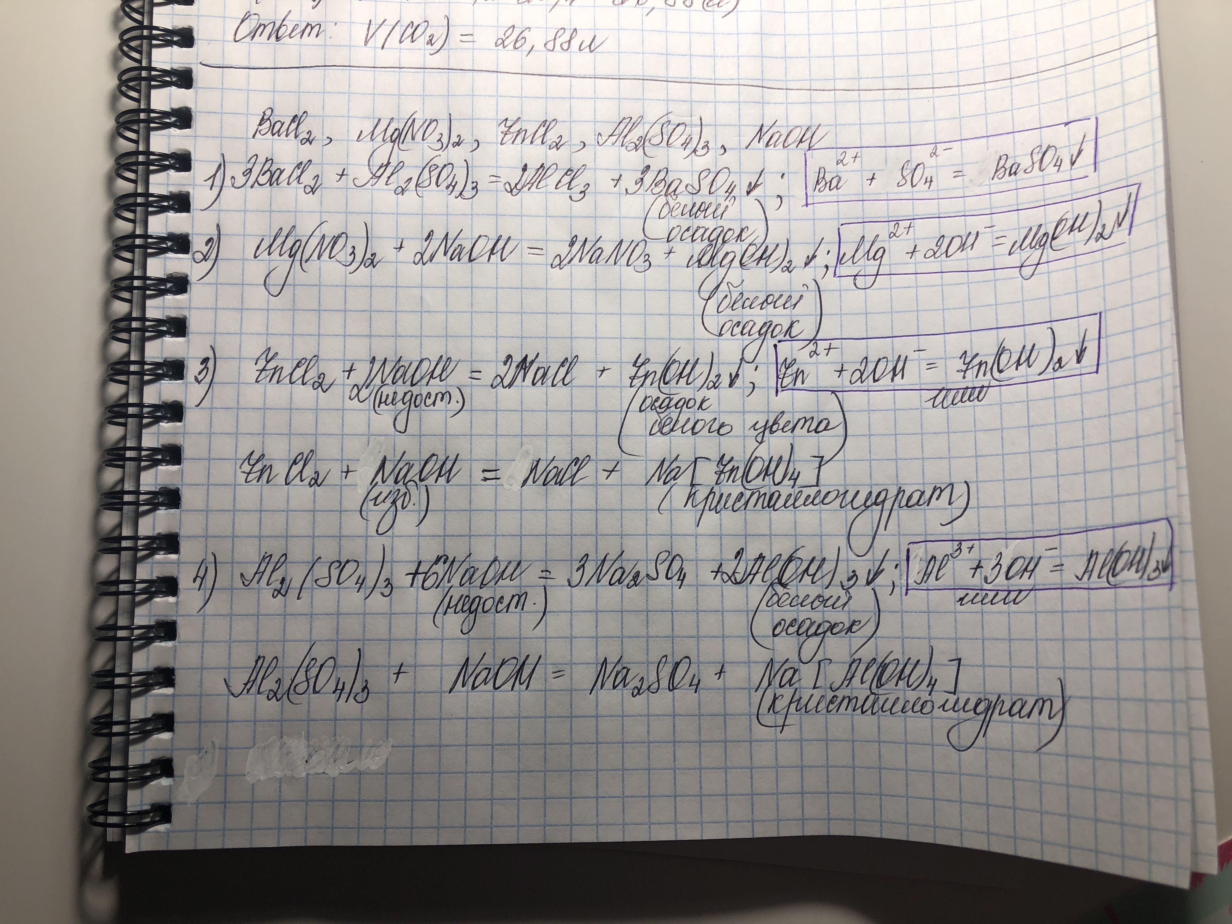 в 5 пронумерованных пробирках находятся растворы следующих веществ:хлорида бария, нитрата магния, хлорида цинка, сульфата алюминия и гидроксида натрия. Используя только эти растворы в качестве реактивов, определите, в какой из пронумерованных пробирок какое вещество находится. Предложите план проведения анализа. Запишите уранения всех соответствующих реакций в молекулярном и ионном виде.