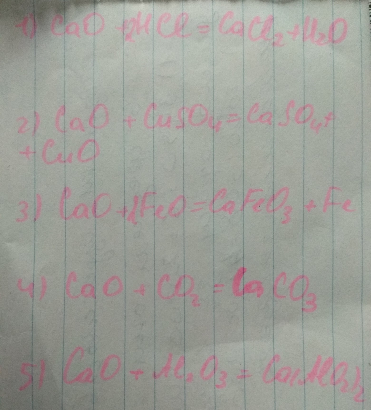 CaO : 1) HCl, 2) CuSO4, 3) FeO, 4) CO2, 5) Al2O3;