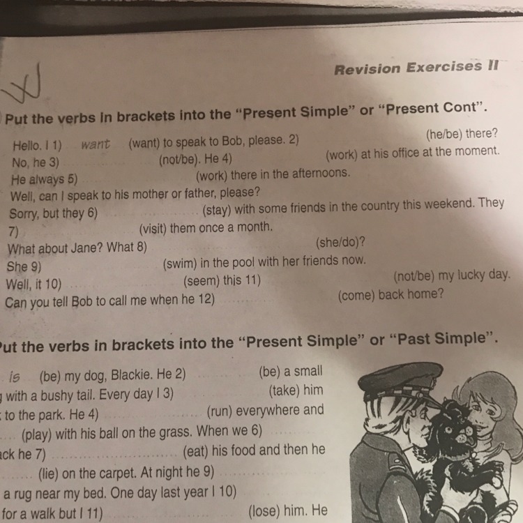 1. Want, Is he there, No, he is not, working, works, are staying, visits, is she doing, swimming, seems, is not, comes