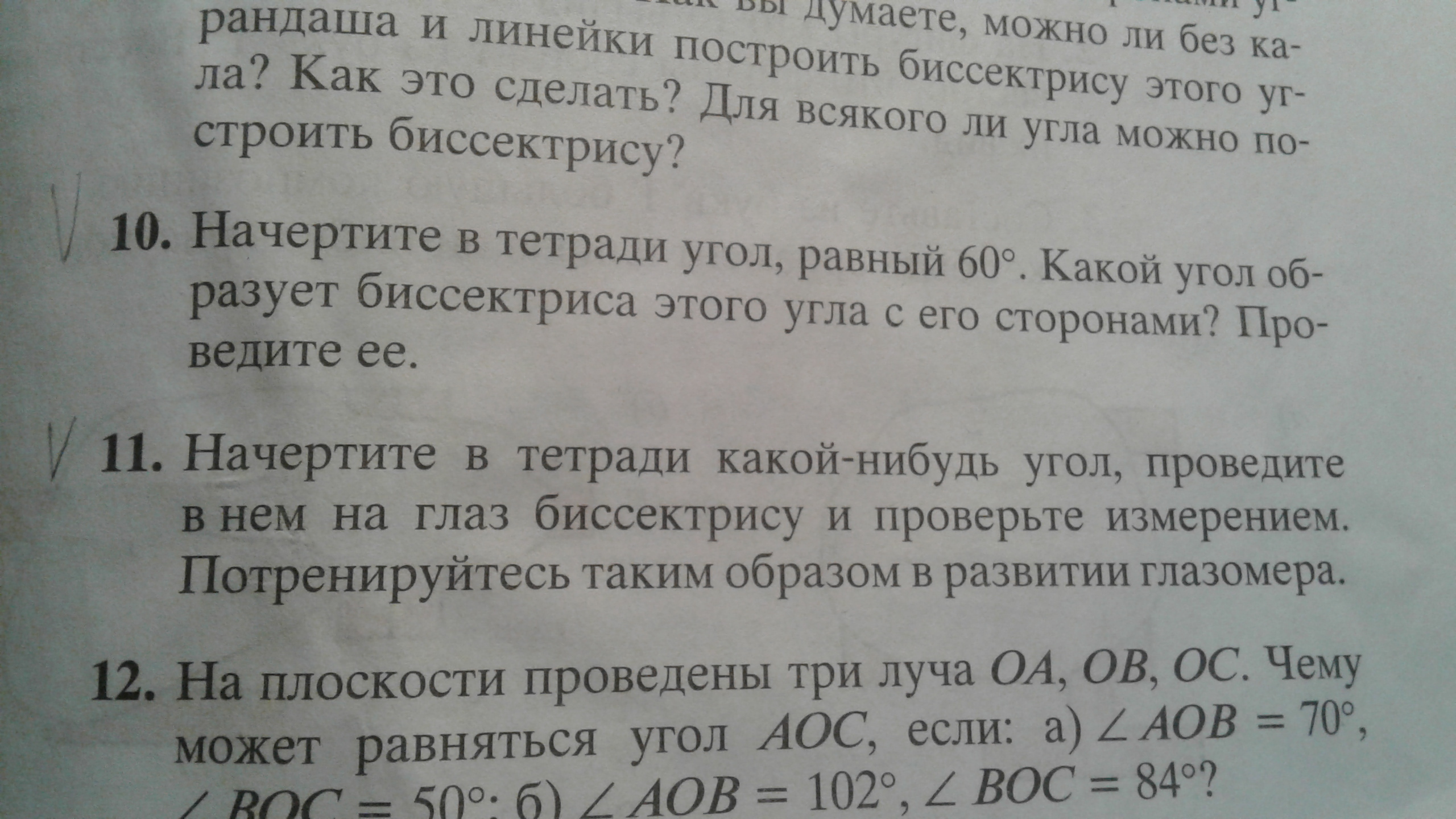 11. Начерти произвольно какой- нибудь угол, на глазок поставь посередине точку и проведи биссектрису, а потом проверь по транспортиру -одинаковые ли получились углы