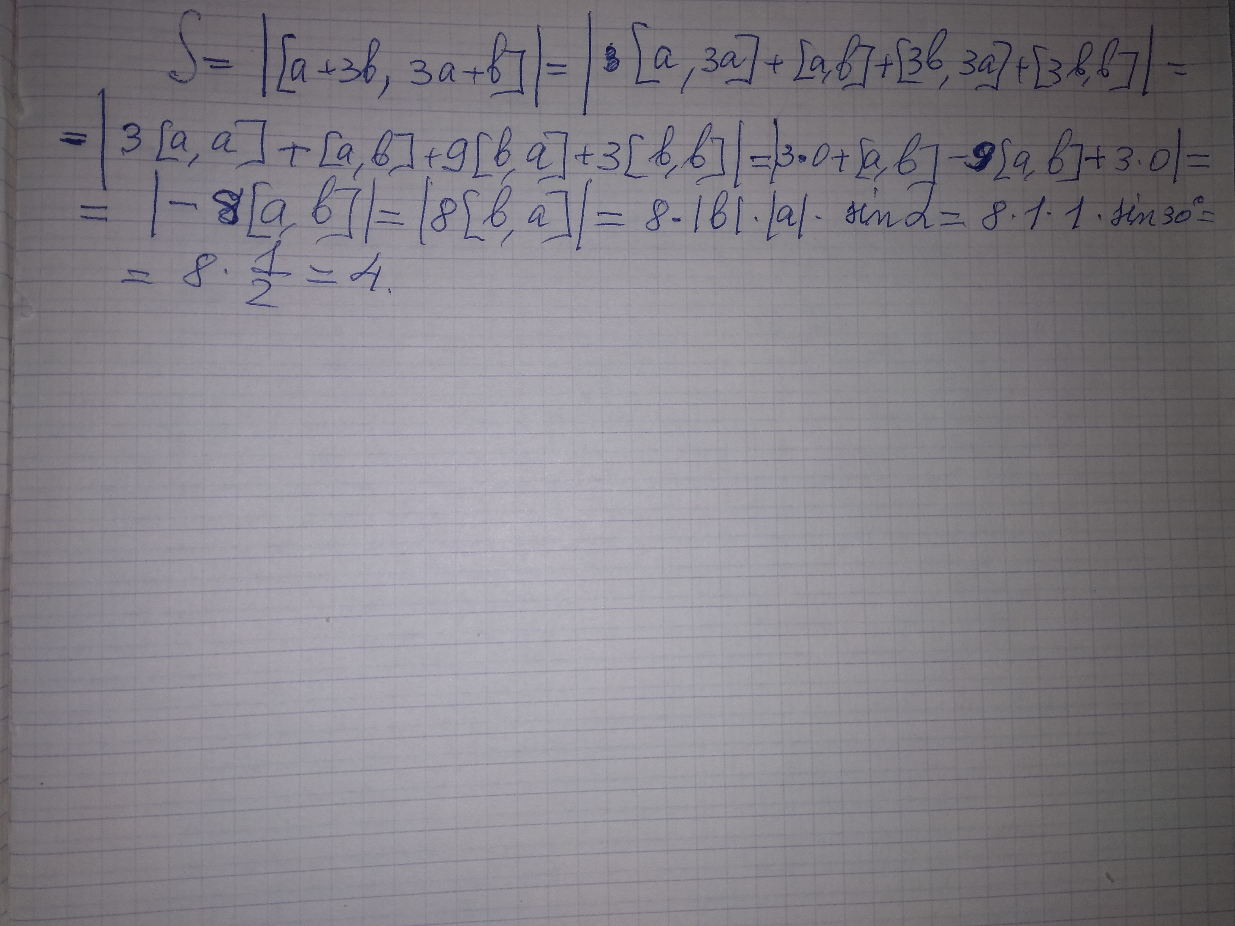вычислить площадь параллелограмма построенного на векторах a+3b и 3a+b если IaI=IbI=1 угол (a^b)=30