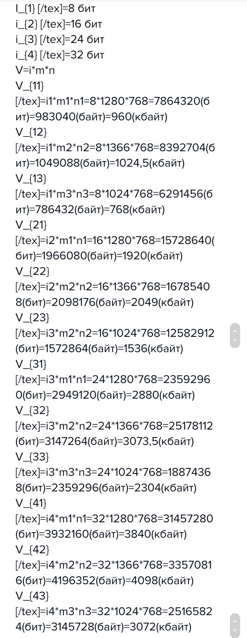 Используются графические режимы с глубинами цвета 8,16,24 и 32бита. Вычислить объемы видеопамяти, необходимые для реализации данных глубин цвета при различных разрешающих способностях экрана.