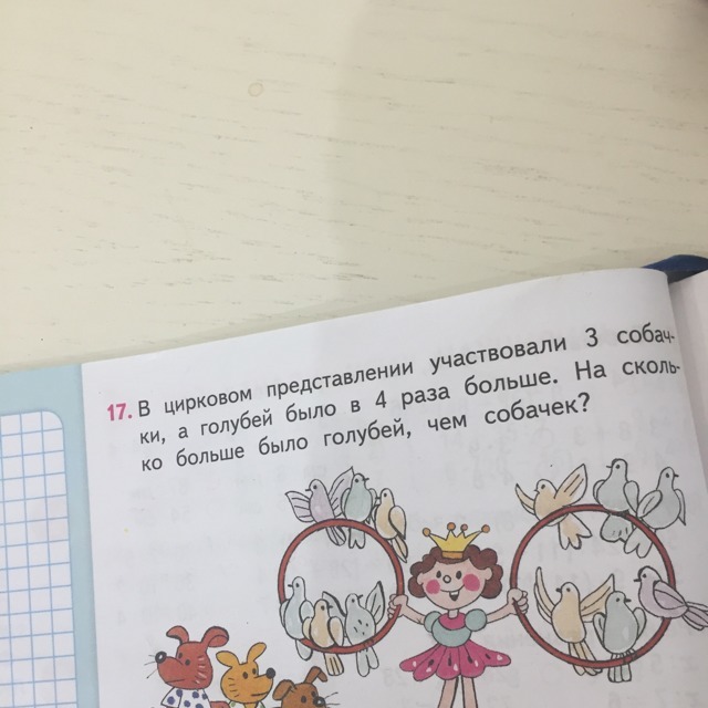В цирковом представлении участвовало (3×4) 12 голубей. 12-3=9. На 9 голубей было больше, чем собачек