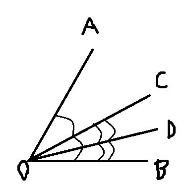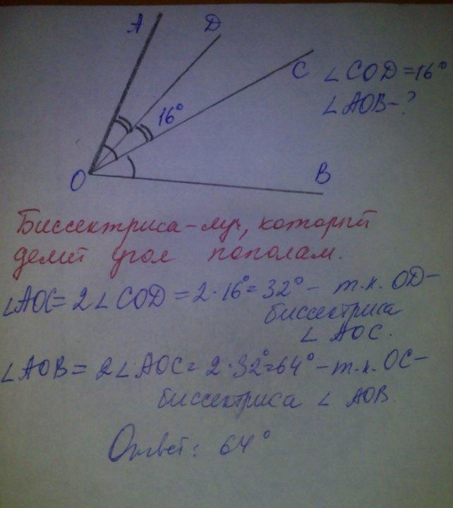 Луч OC является биссектрисой острого угла AOB. Луч OD-биссектриса AOC. Найдите угол AOB, если COD=16 градусам. Ответ дайте в градусах.