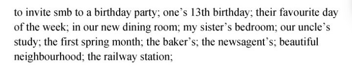 Ту инва'йт са'мбади ту э бё'здэй па'ти; уанс сёрти'нс бё'здэй; зэ'ир фэ'йворит дэй оф зе уи'к; ин а'уэ нью да'йнинг рум; май си'стес бэ'друм; а'ур анклс ста'ди; зэ фёст спринг манс; зэ бэ'йкерс; зэ ньюсэ'джентс; бью'тифул нэ'йборхуд; зэ рэ'илвэй стэйшн;