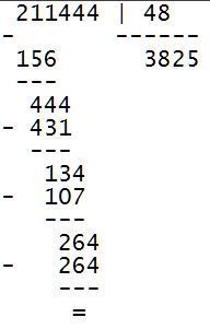 вычислите в столбик 211444 в 9 системе счисления разделить на 48 в 9 системе счисления. Я посчитал на спец. калькуляторе и получилось 3825 но когда в столбик начал считать и подставлять то у меня не получился ответ.Поэтомупрошу помогите