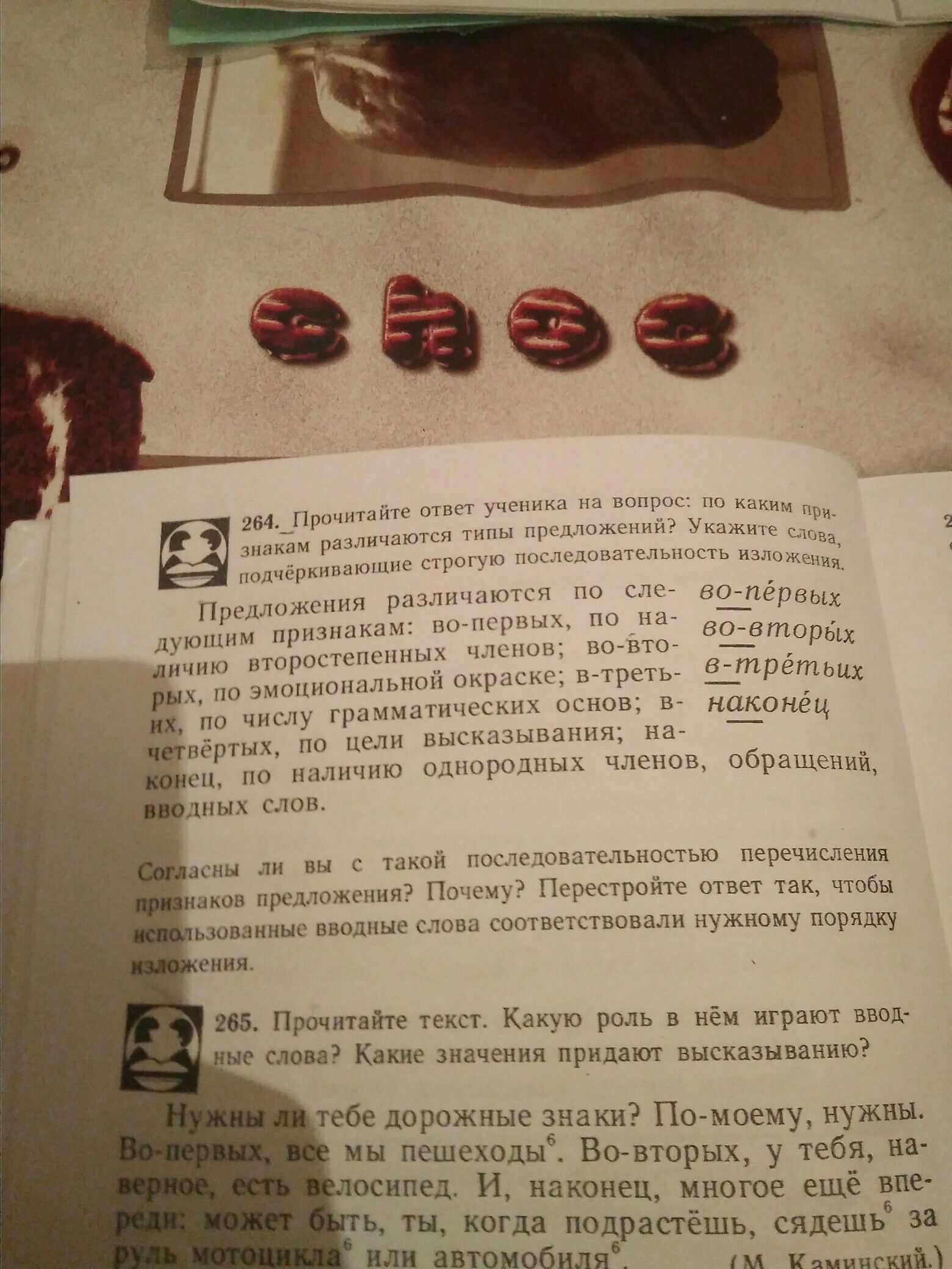 Ответ: Предложения различаются по следующим признакам: ВО-ПЕРВЫХ, по цели высказывания; ВО-ВТОРЫХ, по эмоциональной окраске; В-ТРЕТЬИХ, по числу грамматических основ; В-ЧЕТВЁРТЫХ, по наличию второстепенных членов; НАКОНЕЦ, по наличию однородных членов, обращений, вводных слов.