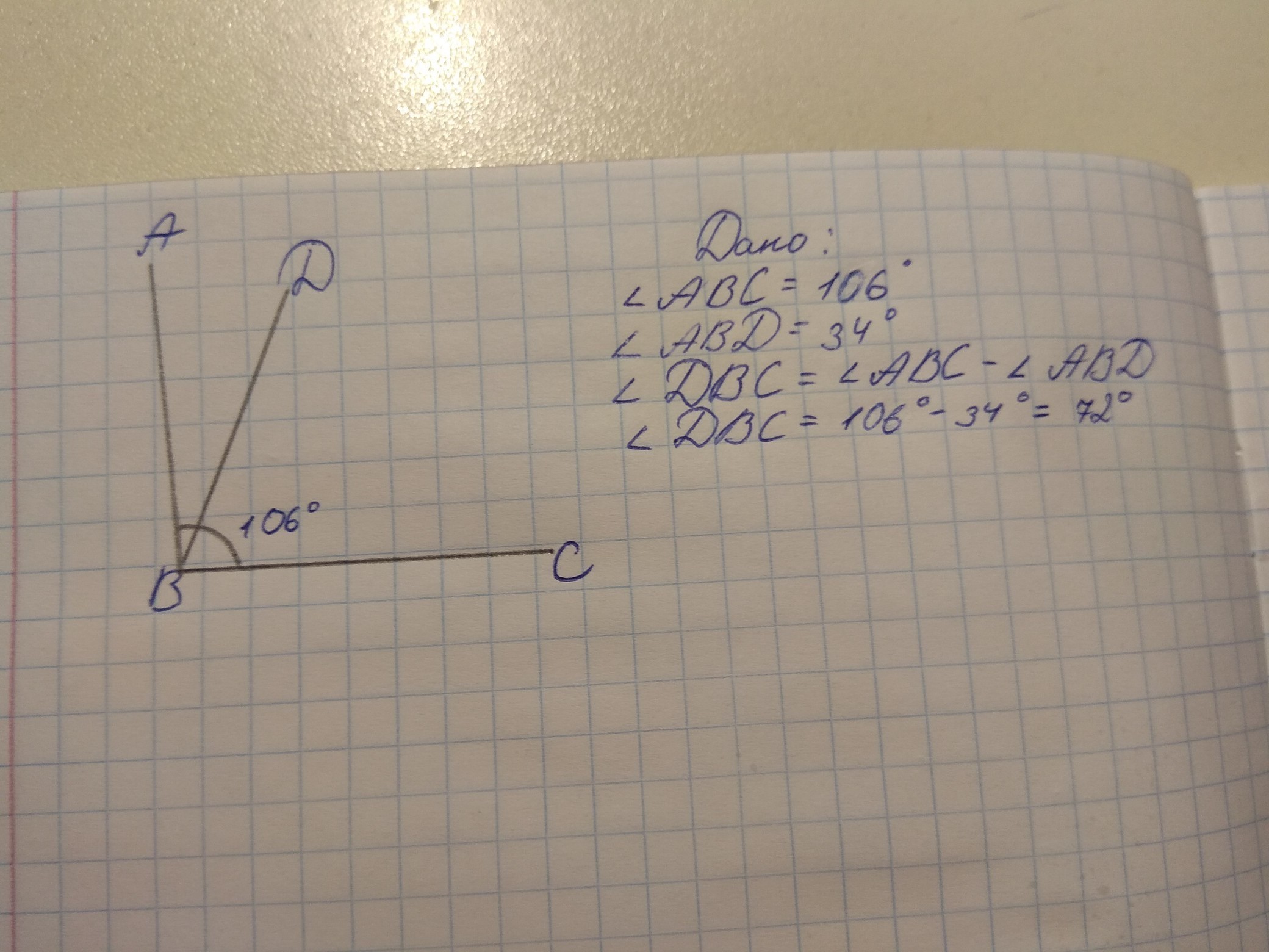 Начертите. Угол ABC равный 106 градусов. Лучом. BD разделите. Этот угол. На два угла так. Чтобы угол ABD=34. градуса. Вычеслите величину угла DBC