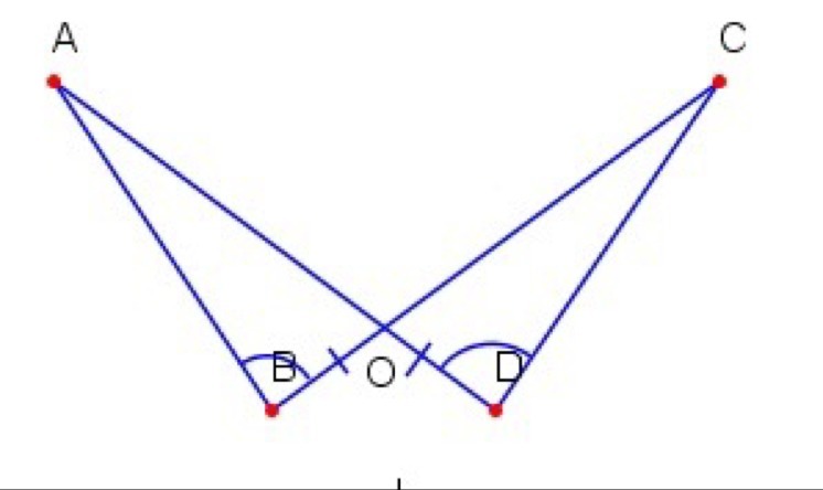 Углы DOC и BOA вертикальные, значит, они равны, поэтому треугольники равны по стороне и двум прилежащим к ней углам(BO=OD по условию, угол B=углу D и угол DOC=углу BOA)