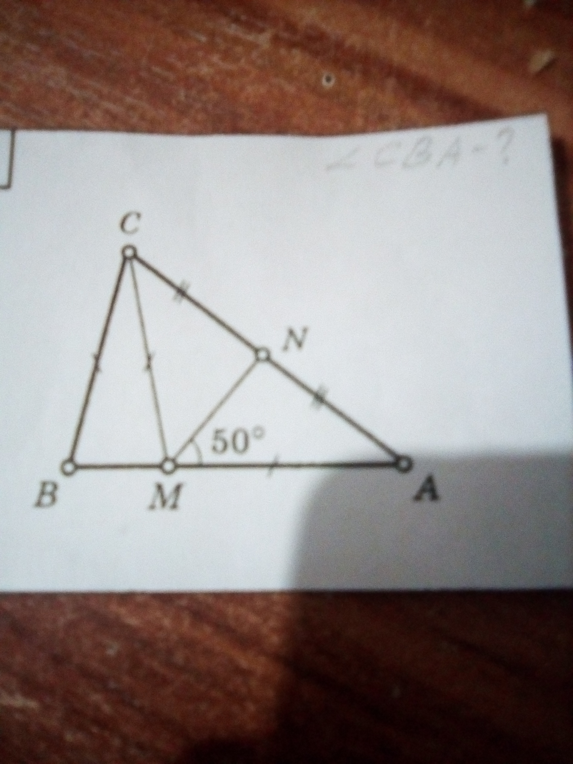 В треугольнике MNA угол N прямой =90 градусам. Угол А= 180-90-50=50 градусов - по теореме. В треугольнике CMN угол N1 = 90 градусам. Так как треугольники MNA и CMN равны по двум сторонам и углу, то углы С и M1 раны 50 градусам. Рассмотрим треугольники CMA и BCM. угол M в треугольнике BCM смежный с углом M1 в треугольнике CMA. Но угол М1 =50=50=100 градусам. Следовательно угол М равен 180-100=80 градусам. Треугольник BMC равнобедренный из условий, тогда угол СВА равен 80 градусам по теореме.