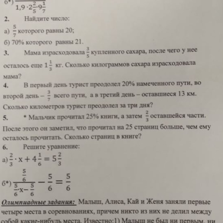 4.В первый день турист преодолел 20% намеченного пути, во второй день - 3/7 всего пути, а в третий день - оставшиеся 13 км. Сколько км турист прошел за три дня?