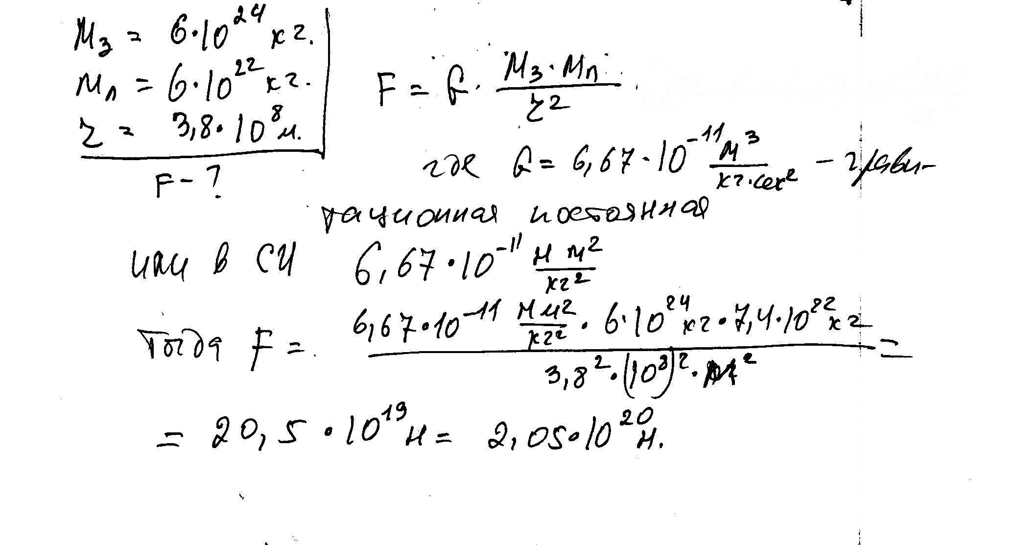 1.Чему равна сила тяготения между Землей и луной, если масса Земли 6*10 24 степени кг, масса Луны 7,4*10 в 22степени кг, среднее расстояние от Луны до Земли 3,8*10 в 8степени м.? Радиусами Луны и Земли пренебречь.