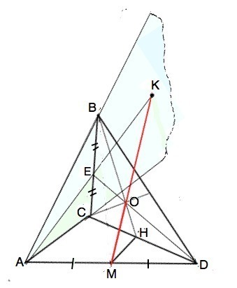 В ∆ АЕD точка М - середина АD, АМ=DМ, ЕО=0,5 DО, следовательно, прямые АЕ и МО не параллельны и пересекутся вне плоскости ∆ ВСD в некоторой точке К, принадлежащей плоскости АВС и лежащей на продолжении медины АЕ.