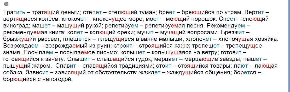 Тратит - тратящий деньги, стелет - стелющийся туман, бреет - бреющийся по утрам, вертит - вертящиеся колеса, клокочет - клокочущее море, моет - моющий порошок, спеет - спеющий виноград, машет - машущий рукой, репетируем - репетируемая песня, рекомендуем - рекомендуемая книга, колет - колющий орехи, мучает - мучающий вопросами,брезжит - брезжущий рассвет, плещут - плещущиеся, хлопочет - хлопочущая, возрождаем - возрождаемый, строят - строящееся, трепещут - трепещущее, посылаем - посылаемое, колышут - колышущиеся, готовят - готовящиеся, слышит - слышащийся, мерцают - мерцающие, пышет - пышущий, славит - славящийся, стоят - дорогостоящие, лает - лающая