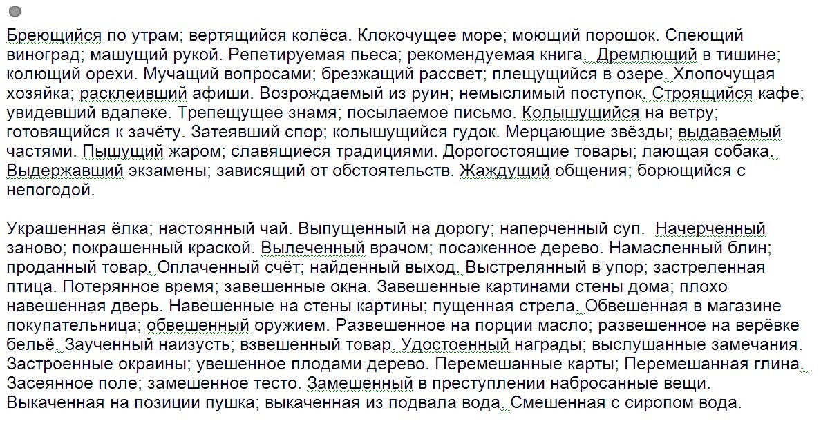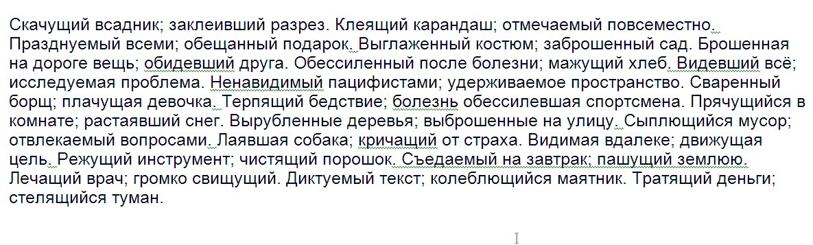 скачущий, заклеивший, клеящий, отмечаемый, празднуемый, обещанный, выглаженный, заброшенный, брошенная, обидевший, обессилевший, мажущий, видевший, исследуемая, ненавидимый, удерживаемое, сваренный, плачущая, терпящий, обессилевшая, прячущийся, расстаявший, вырубленные, выброшенный, сыплющийся, отвлекаемый, лаявшая, кричащий, видимый, движущаяся, режущий, чистящий, съедаемый, пашущий, лечащий, свищущий, диктуемый, колеблющийся, тратящий, стелющийся