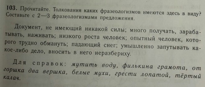 Документ, не имеющий никакой силы-филькина грамота; много получать, зарабатывать, наживать-грести лопатой; низкого роста человек-от горшка до вершка; опытный человек, которого трудно обмануть-тёртый калач; падающий снег-белые мухи; умышленно запутывать какое-либо дело, вносить в него неразбериху-мутить воду.
