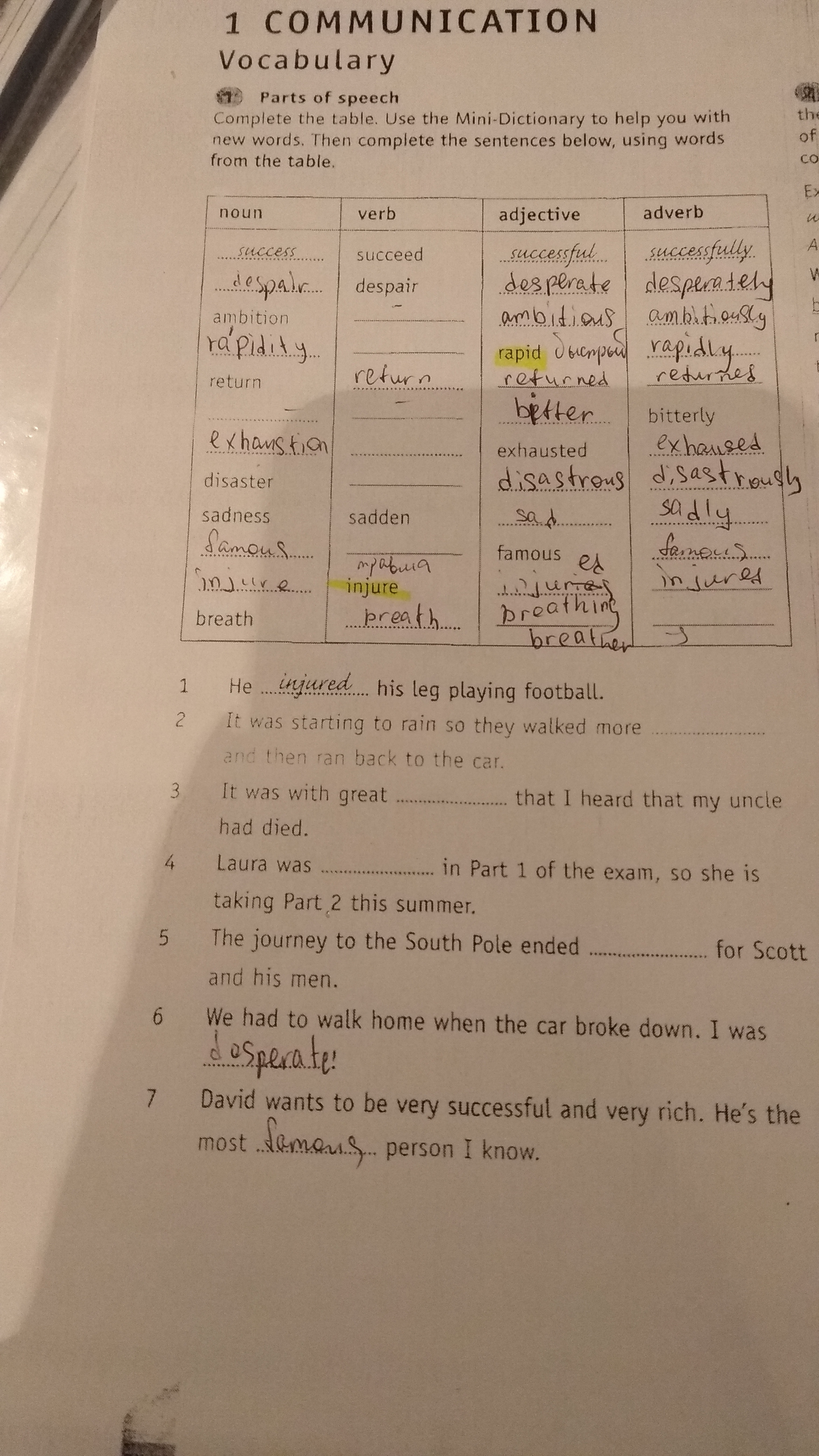 Что касается таблицы то не вижу прилагающегося в условии мини-словаря. Вы не загрузили. Но добавляйте exhaust в колонку глаголов. Там еще вроде есть ошибки, но из-за почерка не разобрать