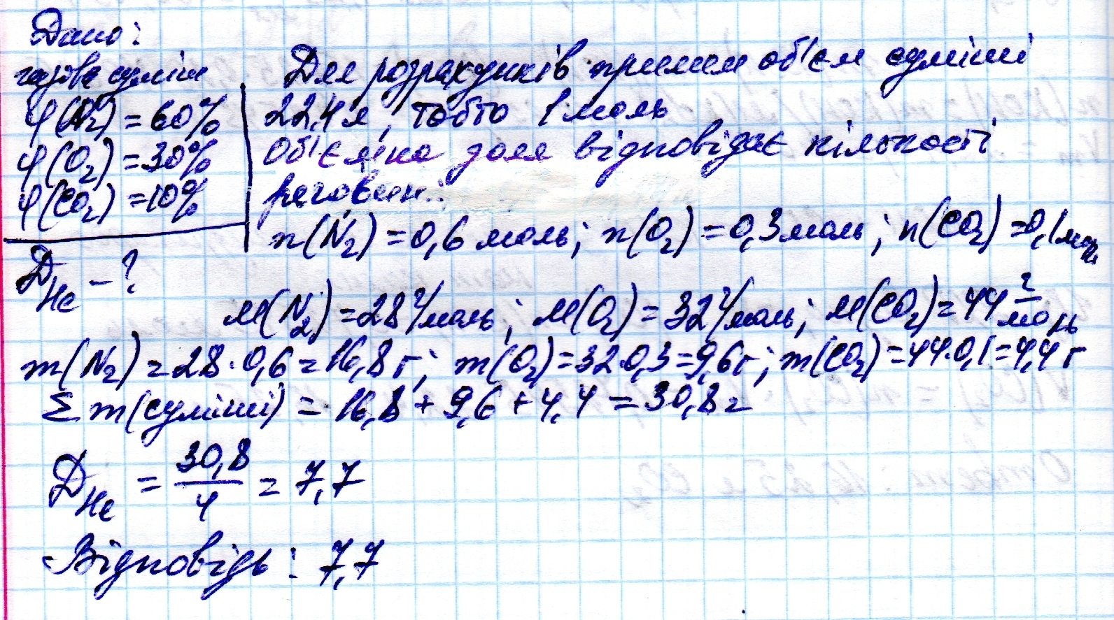 До складу газової суміші входять азот 60%. кисень 30%. карбон IV оксид 10%. Визначте відносну густну цієї суміші з гелієм