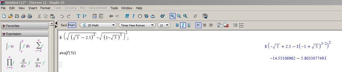 Println(8 * complex.Pow(Sqrt(5) - 2.5 - complex.Pow(Cplx(1, 0)