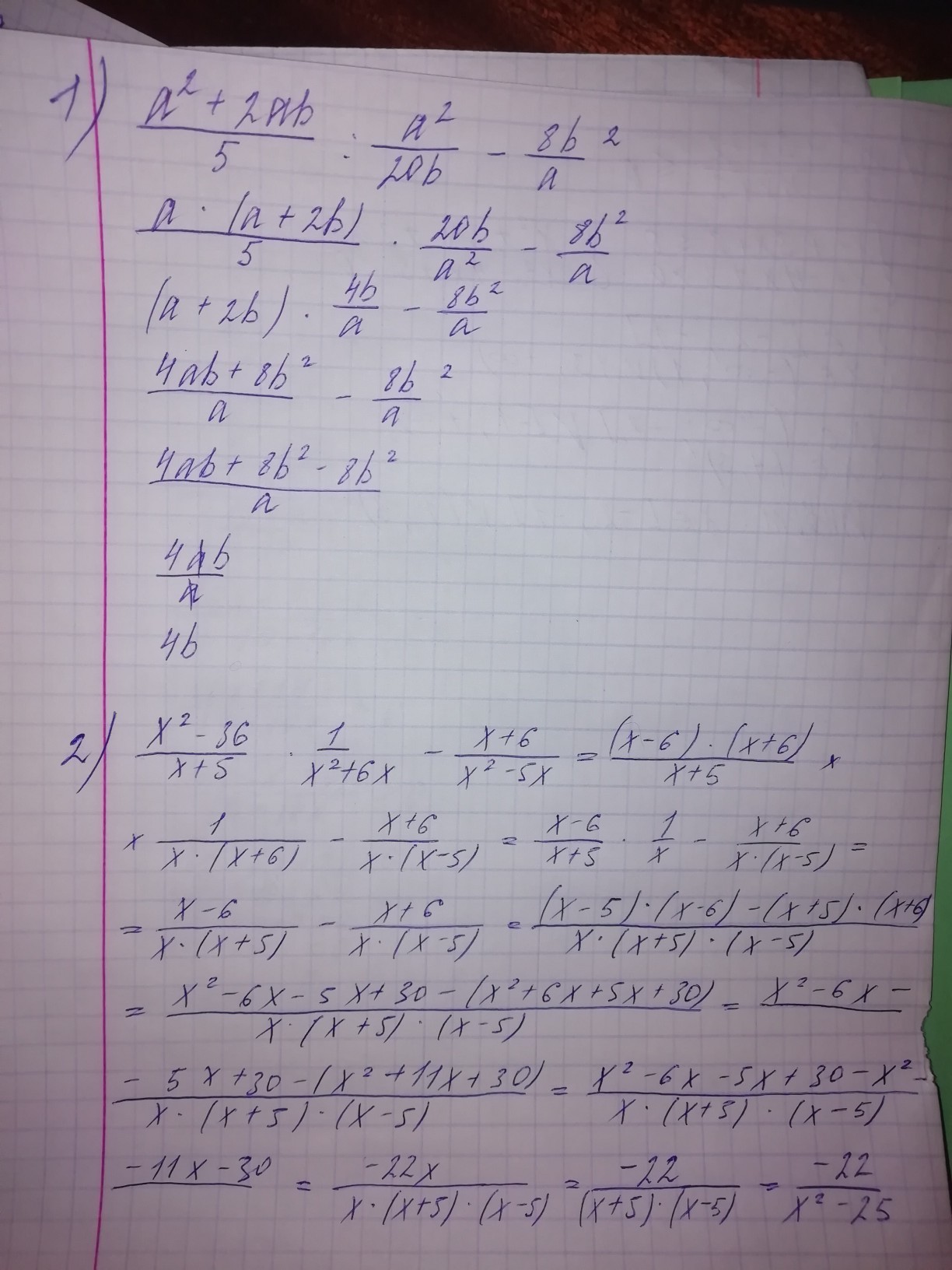1. =(20а²b+40ab²-40ab²)/5a²=20a²b/5a²=4b