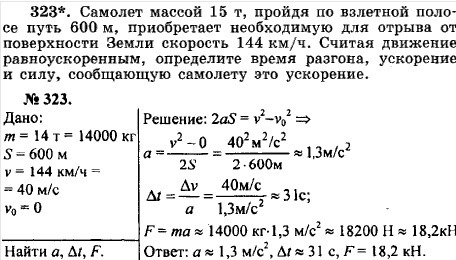 Самолёт массой 15 тонн, пройдя по взётной полосе путь 600 м, приобретает необходимую для отрыва от поверхности земли скорость 144 км/ч. считая движение равноускоренным, определите время разгона, ускорение и силу, сообщающую самолёту это ускорение (2 Закон Ньютона)