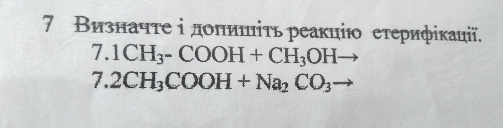 7.1 CH₃-COOH + CH₃OH ---> CH₃-CO-O-CH₃ + H₂O (Kt=H₂SO₄конц,t)
