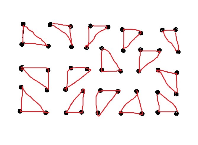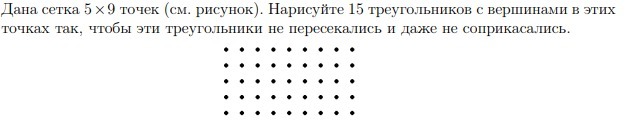 Дана сетка 5×9 точек (см. рисунок). Нарисуйте 15 треугольников с вершинами в этих