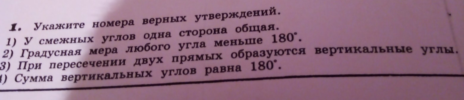 Укажите номера верных утверждений 1 смежных углов одна сторона общая 2 градусная мера любого угла меньше 180 градусов 3 при пересечении двух прямых образуются вертикальные углы 4 сумма вертикальных углов равна 180 градусов что правильно