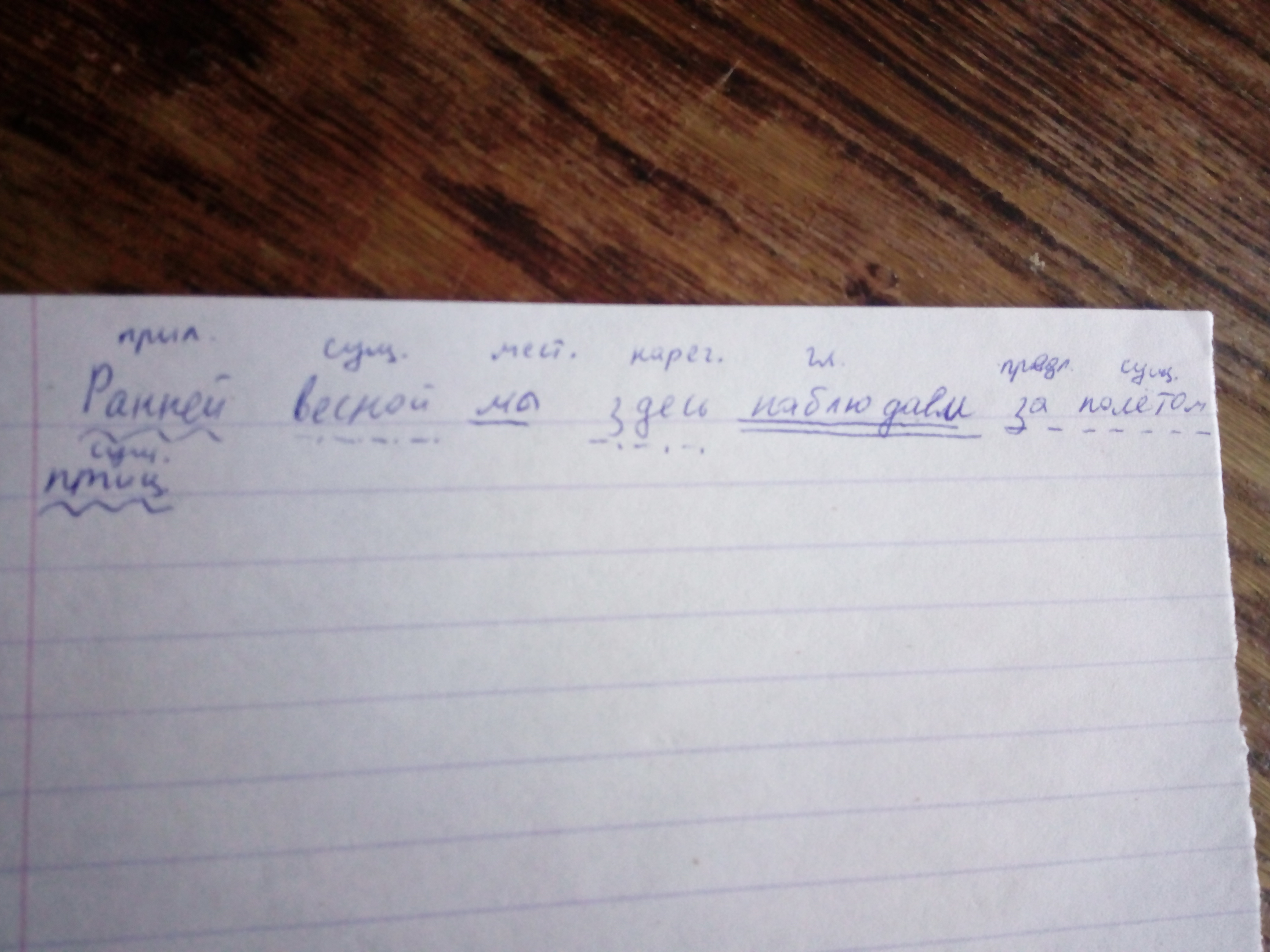 Ранней(определение-прилагат.) весной(обстоятельство-сущ.) мы(подлежащее-местоимение) здесь(обстоятельство-наречие) наблюдаем(сказуемое-глагол) за полётом(дополнение-сущ.) птиц(дополнение-сущ.).