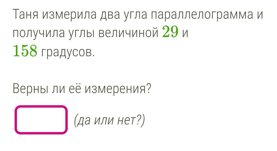 Нет. Так как углы должны быть односторонними, следовательно должны быть или равны или в сумме составлять 180, а поскольку они не равны и не составляют в сумме 180(29+158=187), значит её измерения не верны