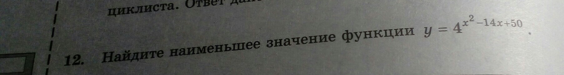Наименьшее значение функция принимает, когда 4^0=1, а это происходит, когда x^2-14x+50=0. Соответственно, D=(-14)^2-4*1*50=196-200=-4. D<0! Это значит, что квадратное уравнение РЕШЕНИЙ НЕ ИМЕЕТ!!! по этому y∈∅!