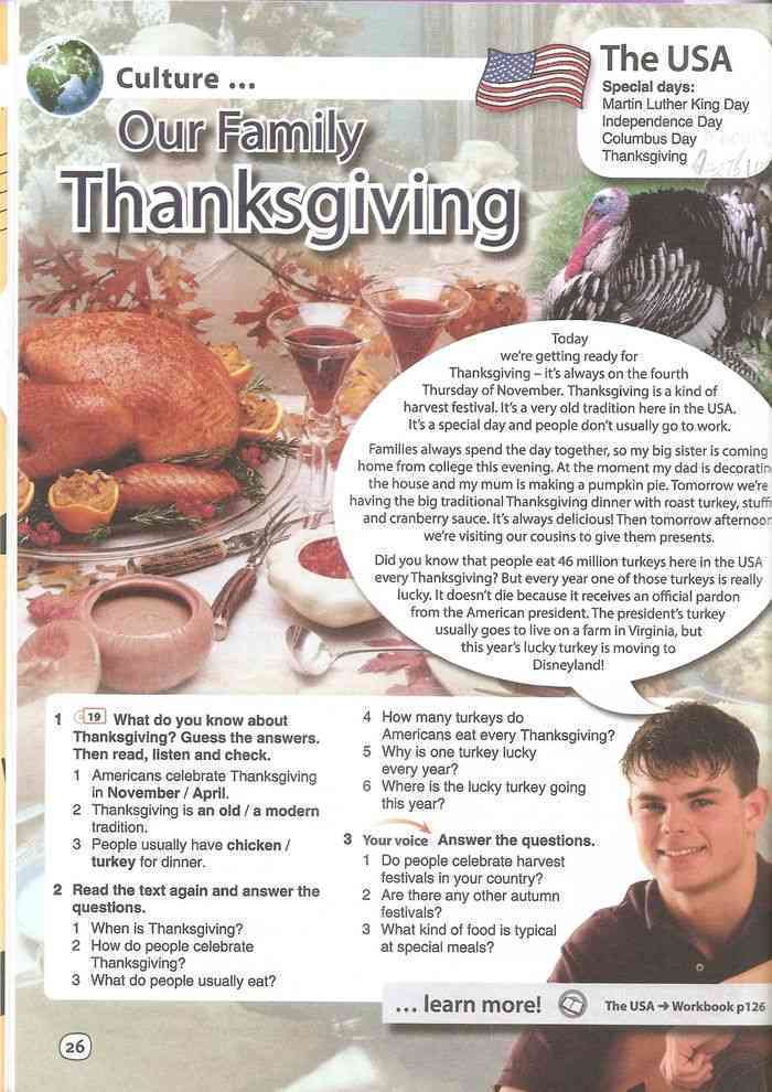 Семьи всегда проводят этот день вместе, потому моя старшая сестра возвращается домой из колледжа этим вечером. Тем временем мой отец украшает дом, а мама занята приготовлением тыквенного пирога. Зaвтра мы отведаем большого, традиционного для Благодарения обеда с жареной индейкой в клюквенном соусе. Это всегда так вкусно! А завтра днем мы навестим наших кузинов и обменяемся подарками.