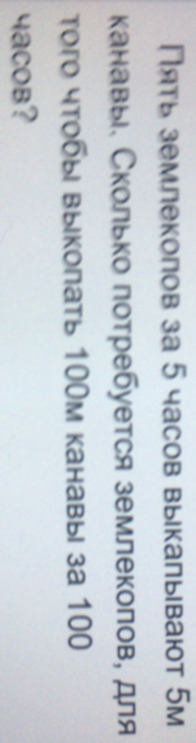 На самом деле, пять землекопов за 5 часов могут выкопать 5 м канавы; значит, пять землекопов за 1 час выкопали бы 1 м канавы, а в 100 часов — 100 м. за один час 5 землекопов выкопают 1 м значит один землекоп копает со скоростью 0,2м/час. а значит за 100 часов один землекоп выкопает 20м. тогда 5 землекопов достаточно!
