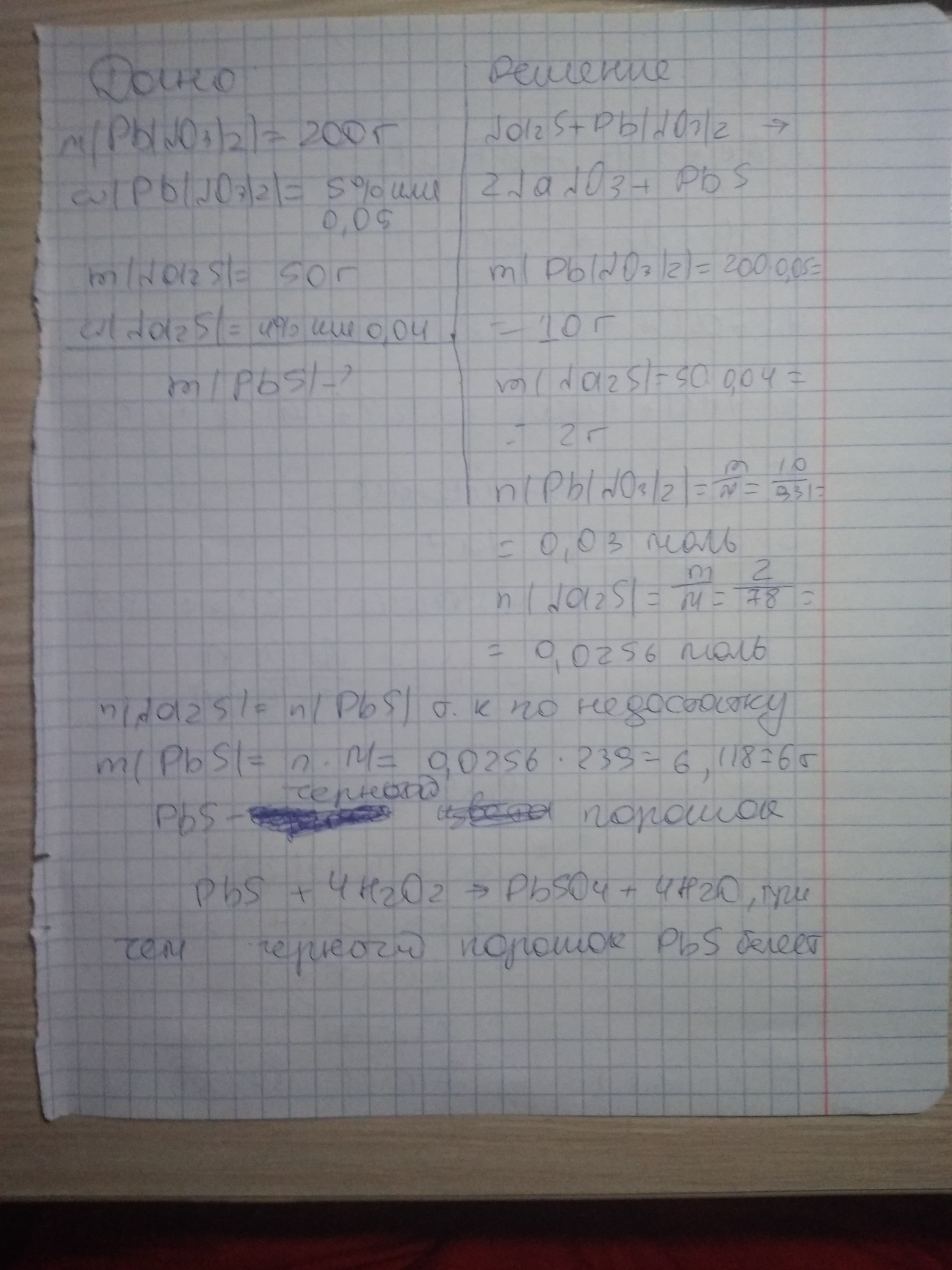 К 200 г 5 % раствора нитрата свинца (II) прилили 50 г 4 % раствора сульфида натрия. На выпавший осадок подействовали избытком раствора перекиси водорода. Цвет осадка изменился (каким образом?). Напишите уравнения реакций и вычислите массу осадка.