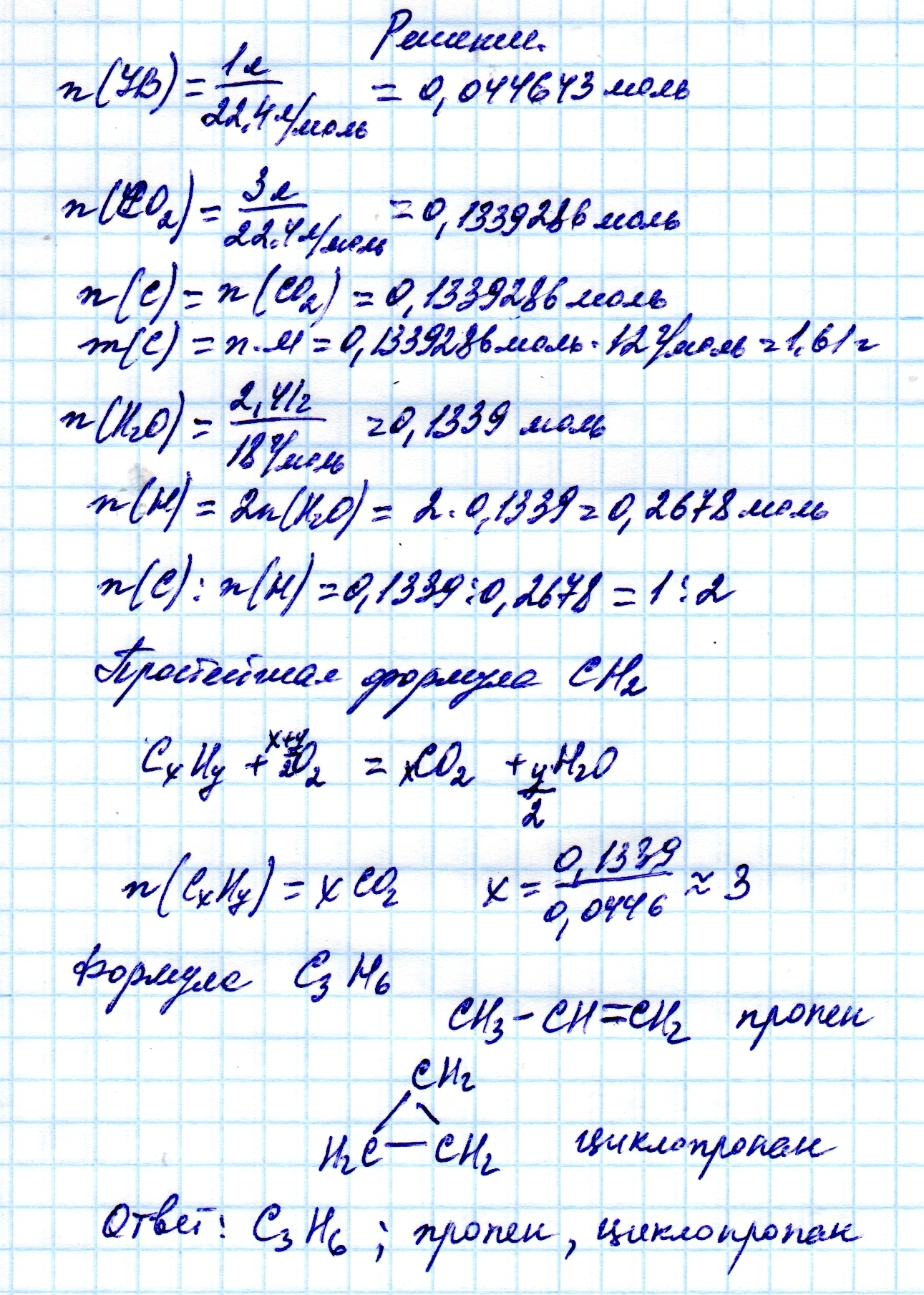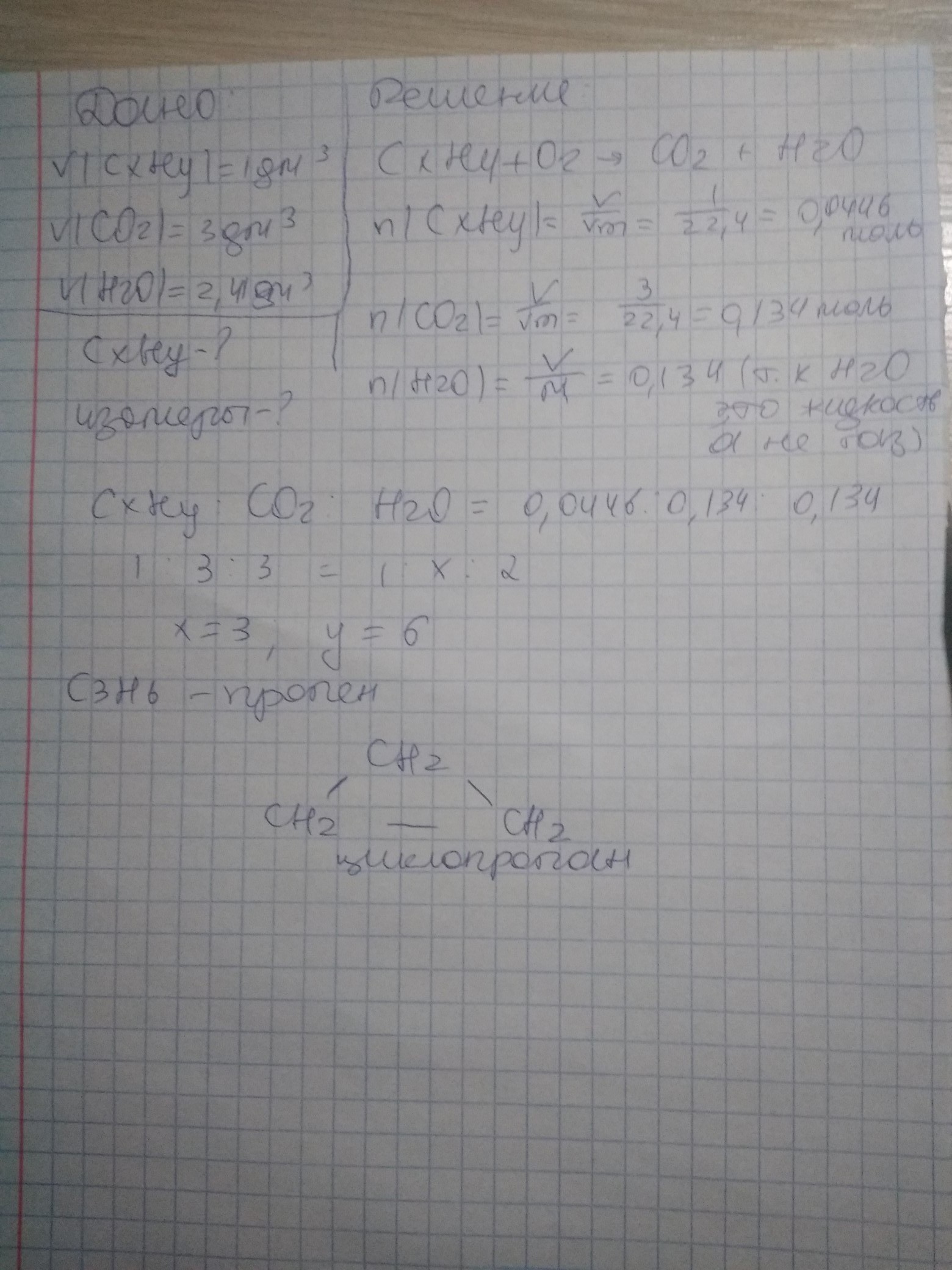 При сгорании 1 л газообразного углеводорода образовалось 3 л оксида углерода(4) и 2,41 воды.Выведите молекулярную формулу вещества и напишите структурные формулы его изомеров.Объемы газов измерены при нормальных условиях.