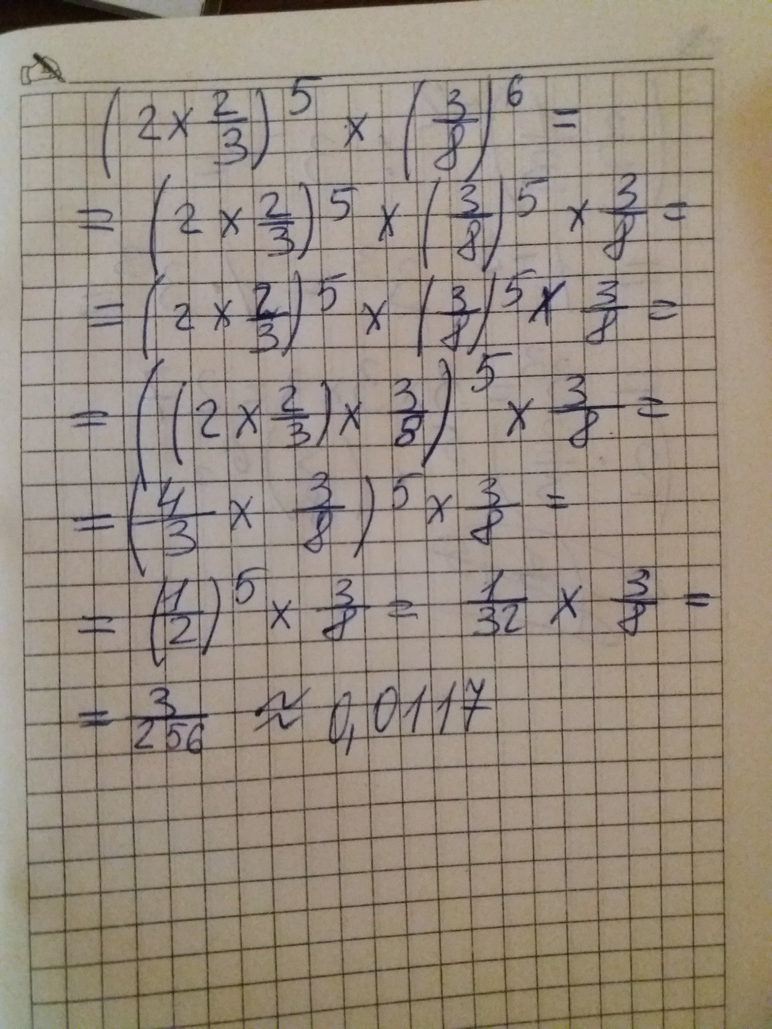 (2²/₃)⁵*(3/8)⁶=(8/3)⁵*(3/8)⁶=(3/8)⁻⁵*(3/8)⁶=(3/8)⁽⁶⁻⁵⁾=(3/8)¹=3/8.