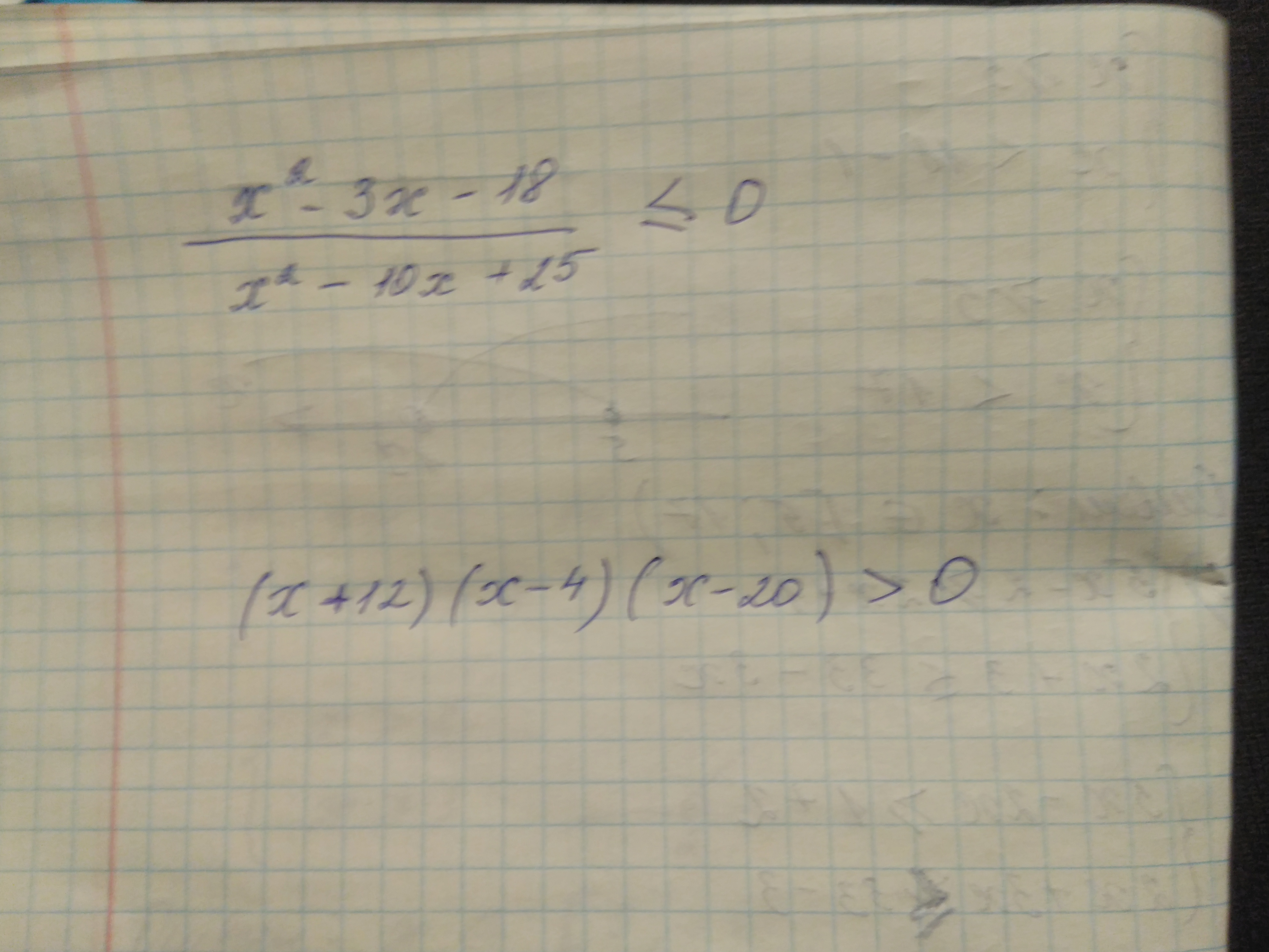 1); ; frac{x^2-3x-18}{x^2-10x+25}leq 0; ; ,; ; frac{(x-6)(x+3)}{(x-5)^2}leq 0\\x_1=-3; ,; x_2=6; ,; x_3ne 5\\znaki:; ; ---[-3, ]+++(5)---[, 6, ]+++\\xin (-infty ,-3, ]cup (5,6, ]\\2); ; (x+12)(x-4)(x-29)>0\\x_1=-12; ,; x_2=4; ,; x_3=20\\znaki:; ; ---(-12)+++(4)---(20)+++\\xin (-12,4)cup (20,+infty )