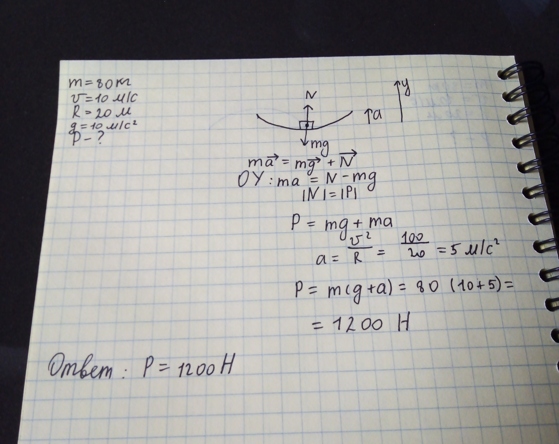 Ускорение направленно наверх, потому что если мы достроим до окружности, то ускорение тела, Движущегося по окружности, направлено в центр, центростремительное ускорение.