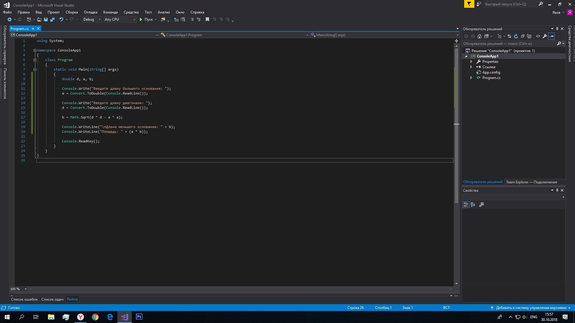Console.WriteLine("nДлина меньшего основания: " + b);